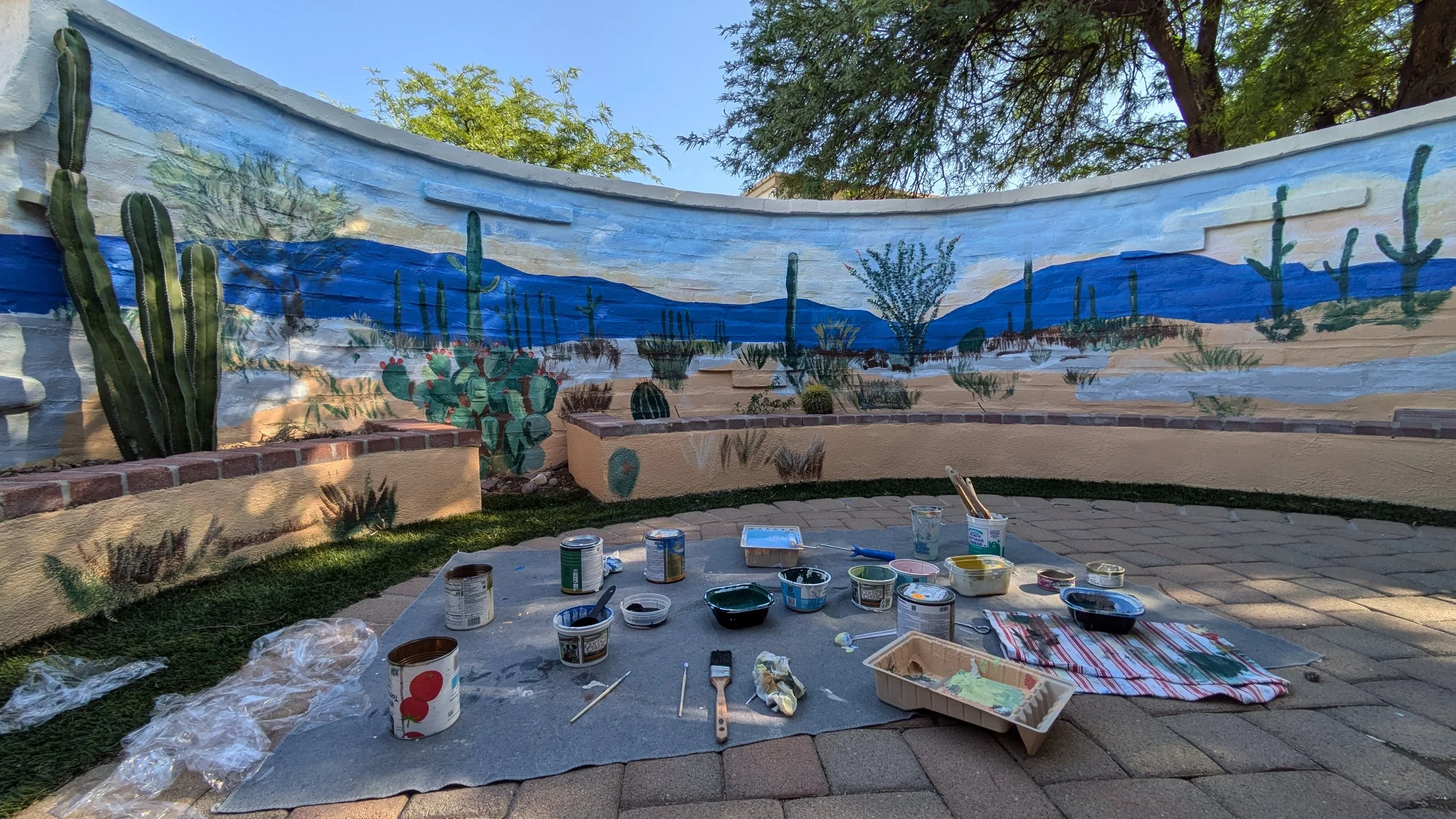 Private residence mural, Tucson AZ 7/2024 Work in progress: 40 feet long x 6 feet tall Bringing the desert to viewers backyard